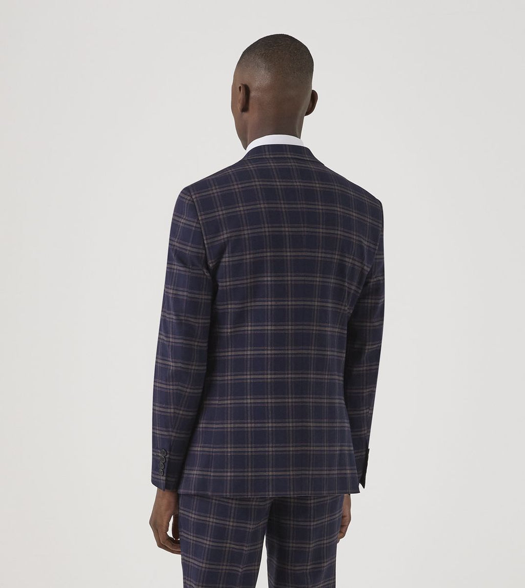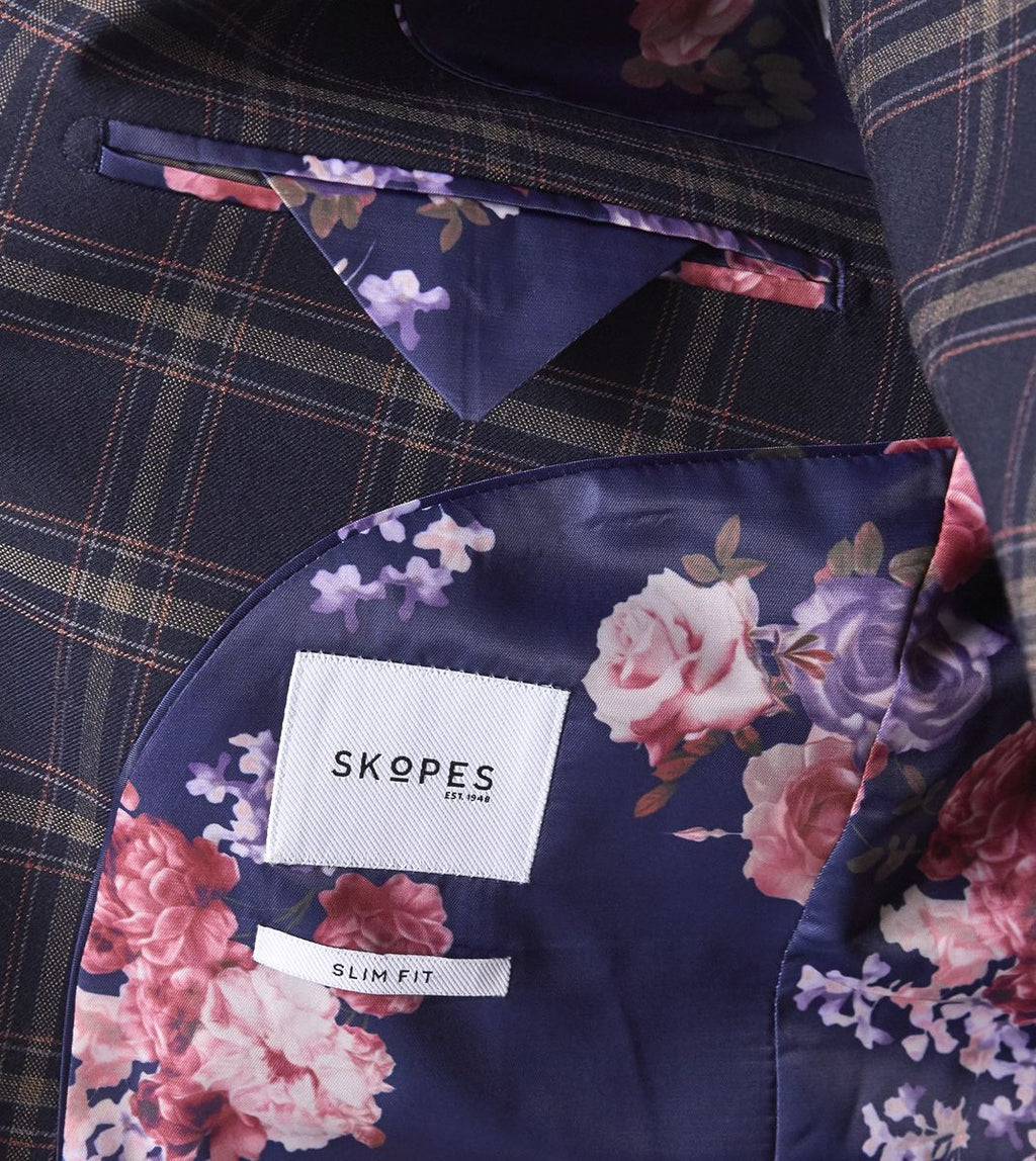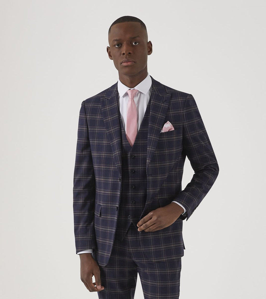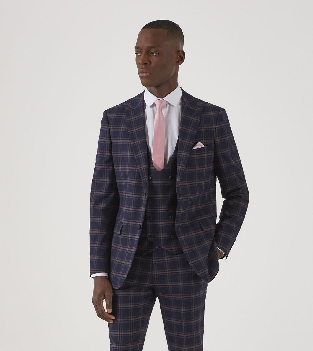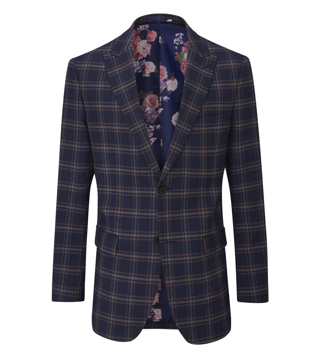 I'm Stewart, a single-breasted suit jacket in silhouette-defining slim fit. With my navy and pink check, peak lapel and floral print lining, I definitely wasn't designed to blend into the background. Put me on with my matching Stewart suit trousers and waistcoat and step out in style.