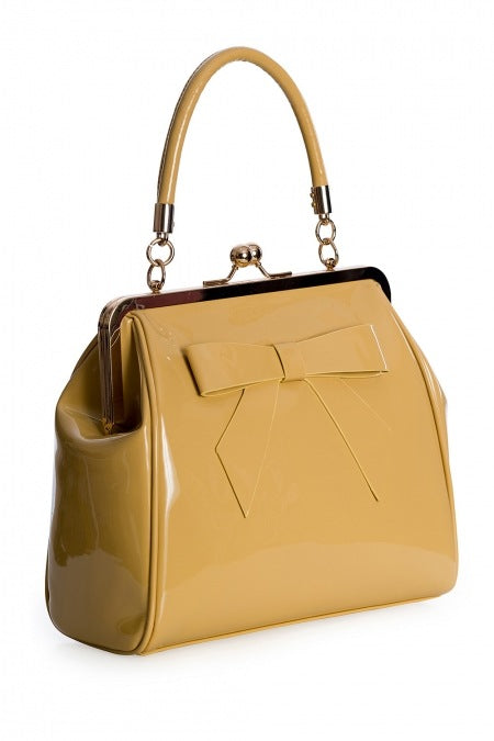 Inspired by a classic vintage design, in a patent PU Leather, with bow detail, kiss lock clasp and detachable adjustable shoulder strap.