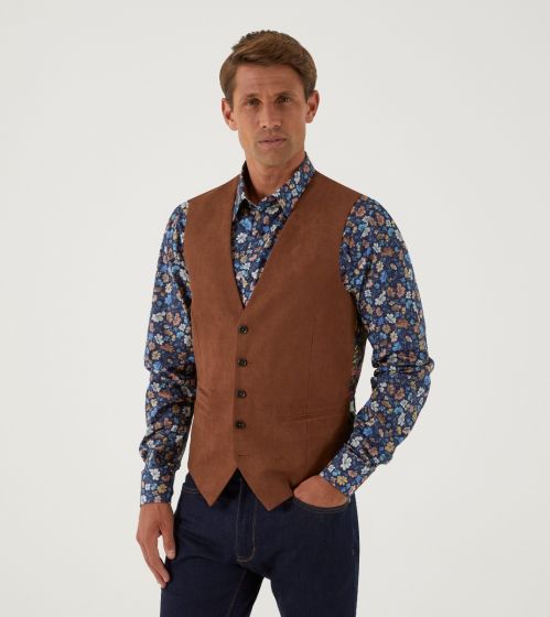 I’m Camplin, a single-breasted waistcoat cut from a ginger suede cloth. Together with my adjustable back straps and jetted pockets, I’m just the ticket for channelling that classic countryside look. Take a look at my floral print lining too – I’d say it’s the cherry on top.