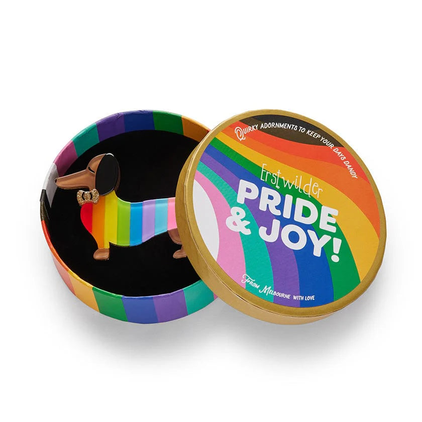 Erstwilder original Spiffy the Sausage Dog has received a most marvellous makeover, inspired by the progress pride flag, and they are dressed to impress! Sporting a bold hand-assembled rainbow resin jumper and wearing a golden glitter resin bow tie, this darling Dachshund will lend a supportive paw, whenever you need. Match this design with the Spiffy the Supportive Dog Enamel Earrings, pin, charm and key ring or wear on its own, for a colourful look you can be proud of.