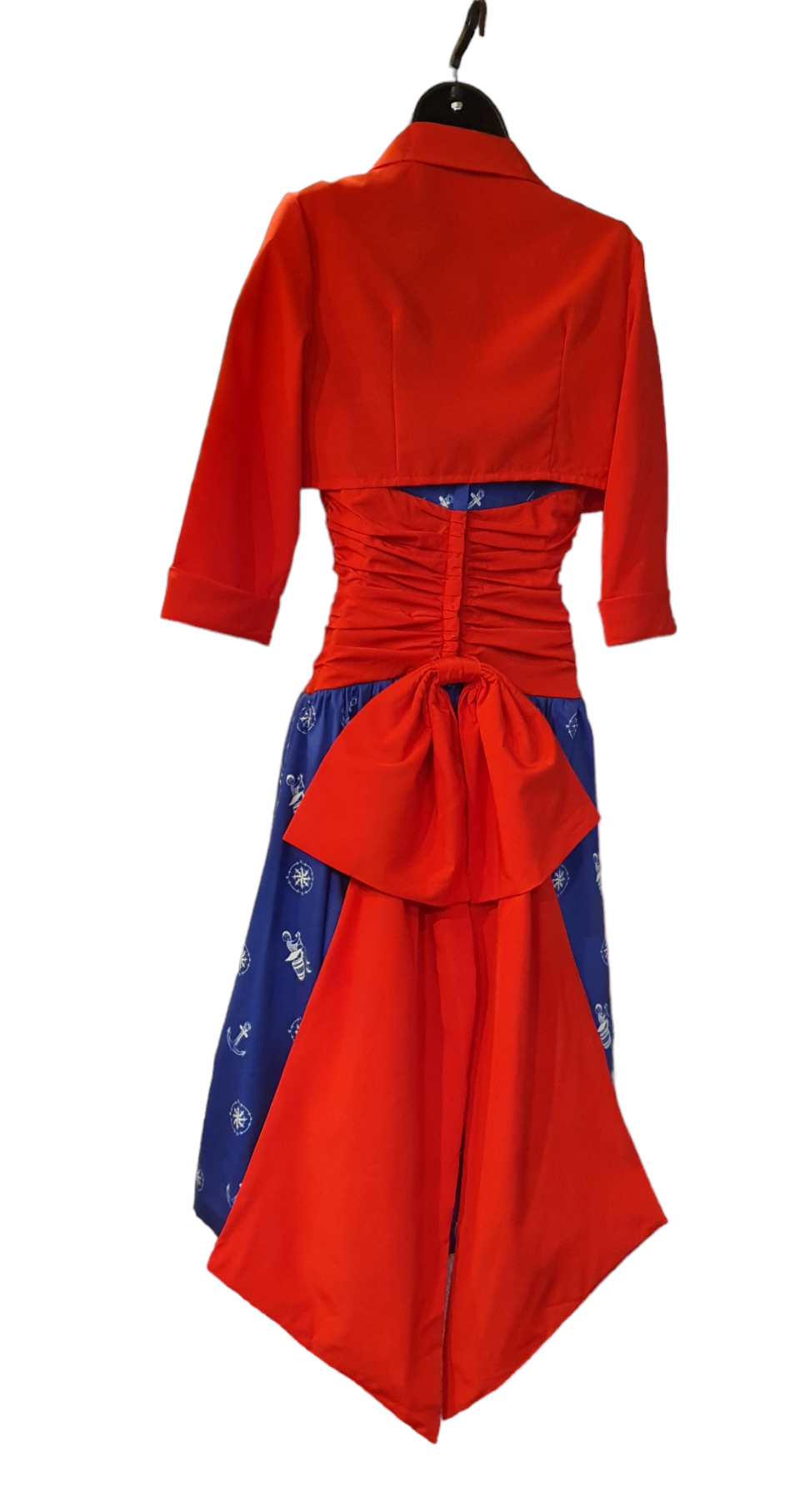 We love the red almost corset style detailing, and the detachable BIG bow that sits at the back of the dress with almost train like quality to it. We included a matching red bolero to cover a bit more of the arm for those chillier evenings.