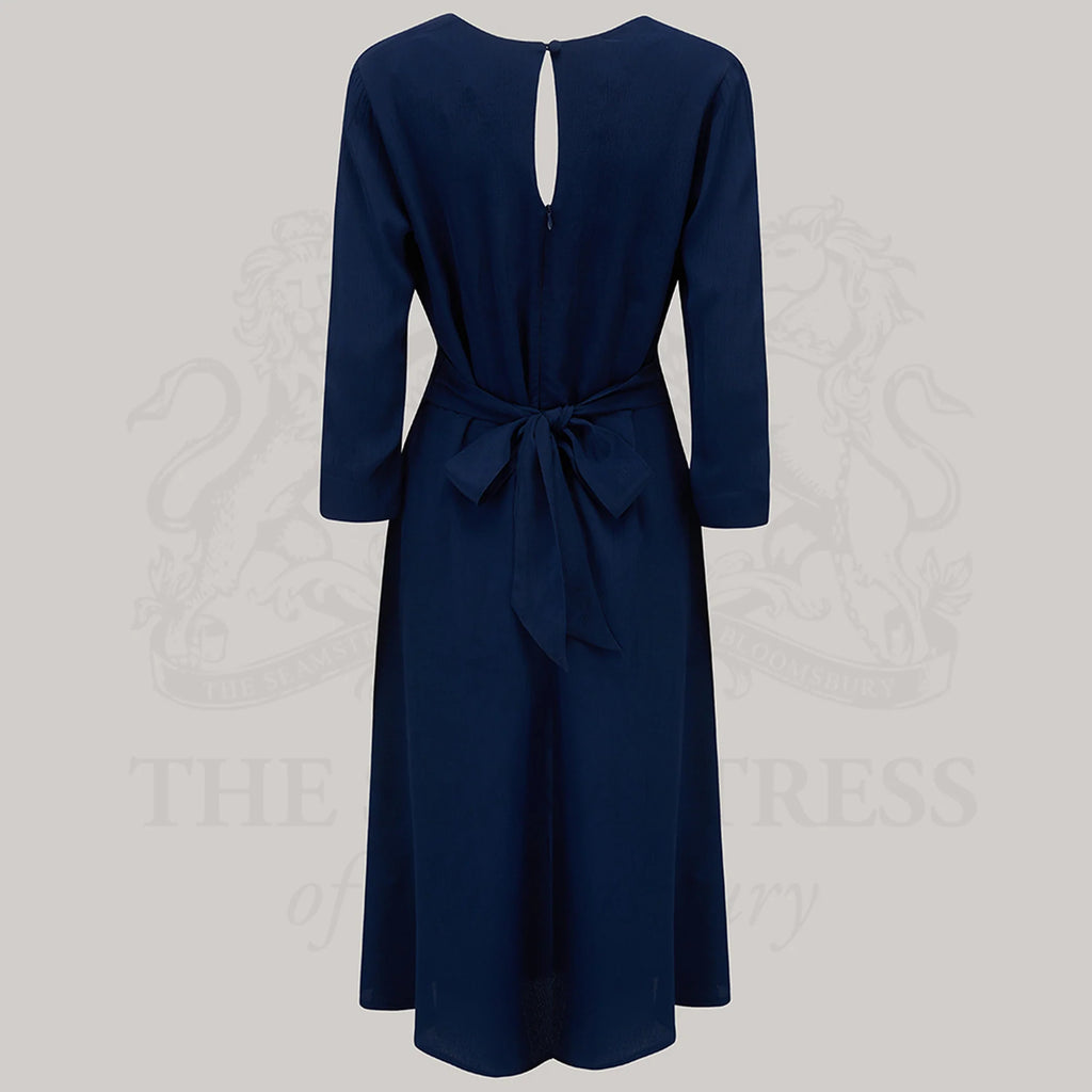 The epitome of stylish glamour, this dress has a sweetheart neckline with a centre front Pussy Bow, as produced by so many designers in the 40s. It also has a keyhole opening at the centre back neck and zip fastening, with waist ties for easy fitting, and 3/4 sleeves.