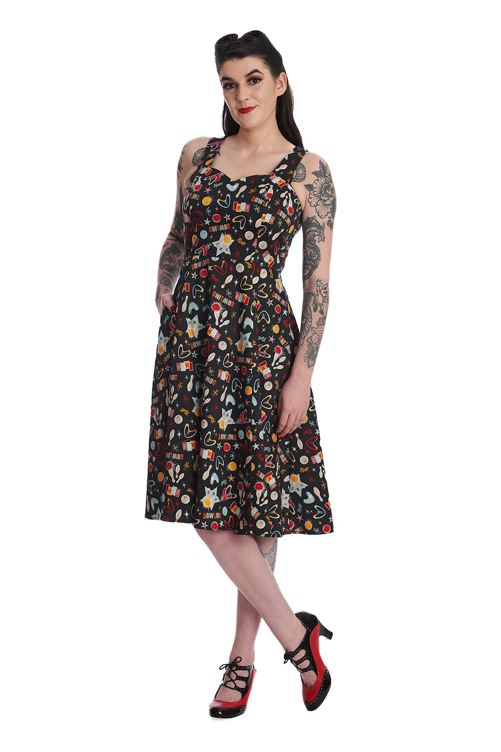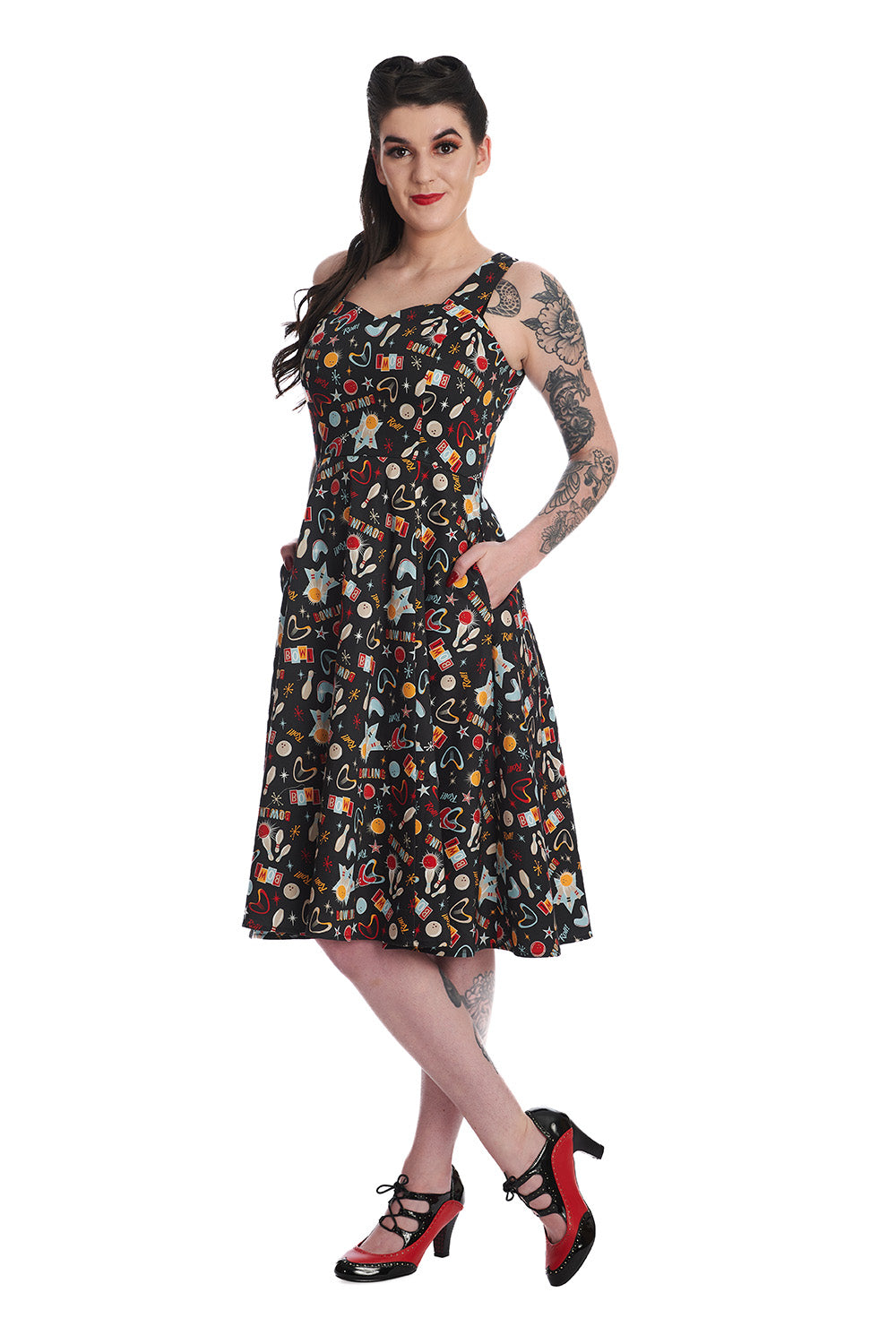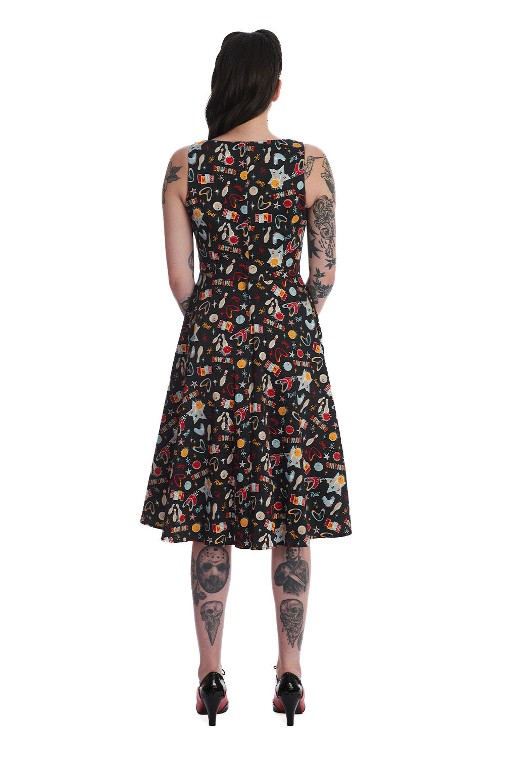 We are loving this bowling inspired collection... The print on this dress is super fun and playful with bowling inspired icons.