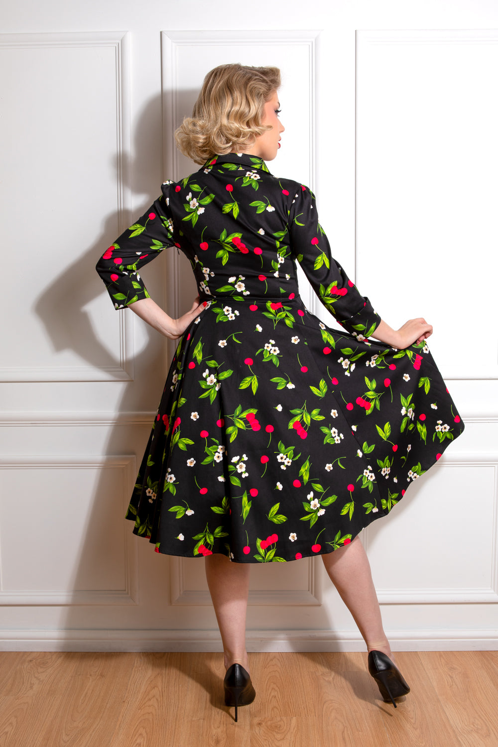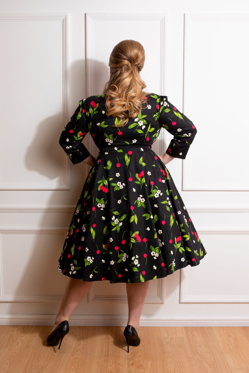 Natasha 1950s Black Cherry Print 3 Quarter Sleeve Swing Dress