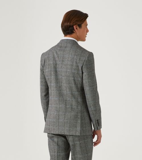 Rowan suit jacket in grey herringbone check wool blend fabric.