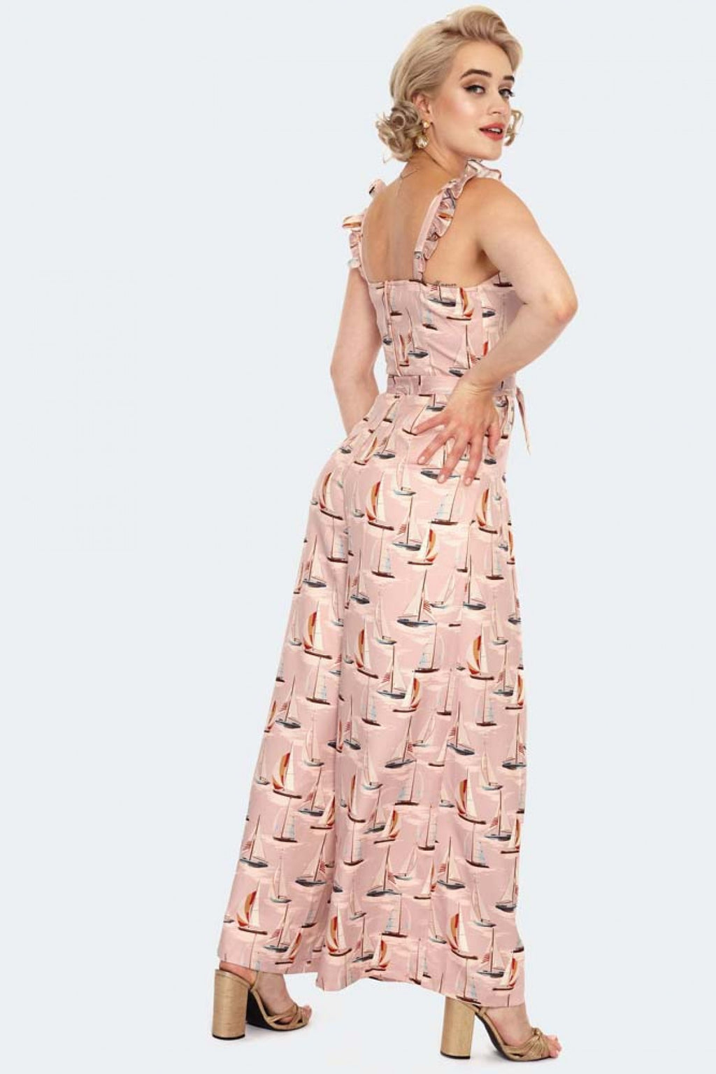 1940s inspired style sail away boat print jumpsuit with thin ruffle detail straps, sweetheart neckline and pleated front wide leg trousers.