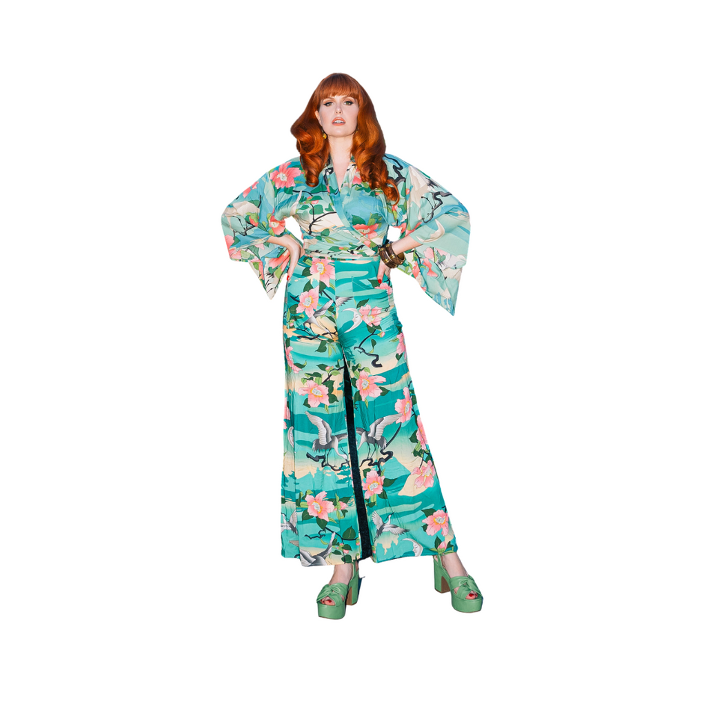 The Carry Me Away set features a traditional kimono sleeve on a comfy cropped wrap top. Paired with matching wide leg pants, in a flowing rayon blue and pink crane print fabric, this set is the perfect 1940s feel summer lounge set.
