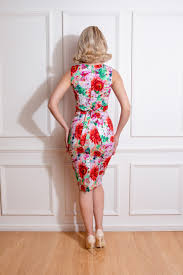 Summer is for loud splashes of colour, and we have the perfect wiggle for you. With its classic simple shape this wiggle brings light to your day with its bold and bright floral print. Featuring a rainbow of colours this style is sure to brighten up any wardrobe. Easy to wear with its classic round neckline, fitted shape and tie belt, this wiggle is perfect for a stroll in the park or an evening dinner. Add your favourite accessories and pair with flats or heels to complete the look.