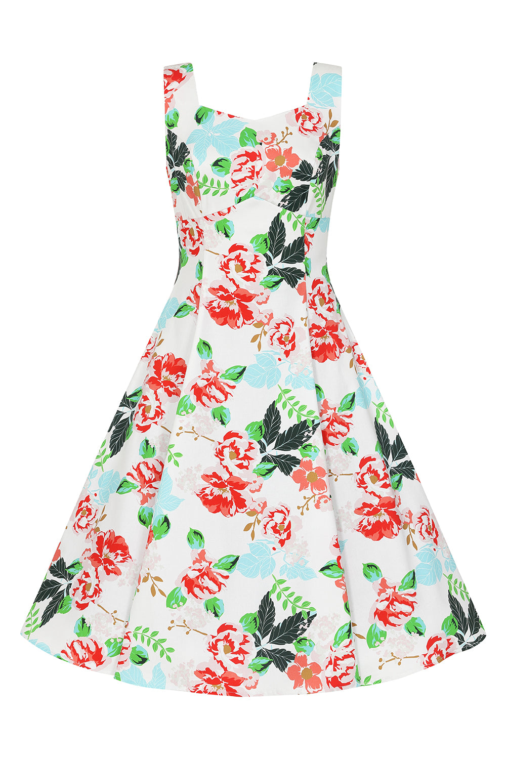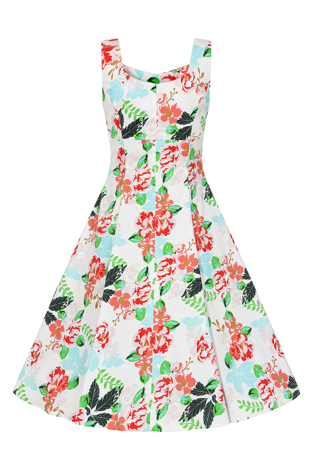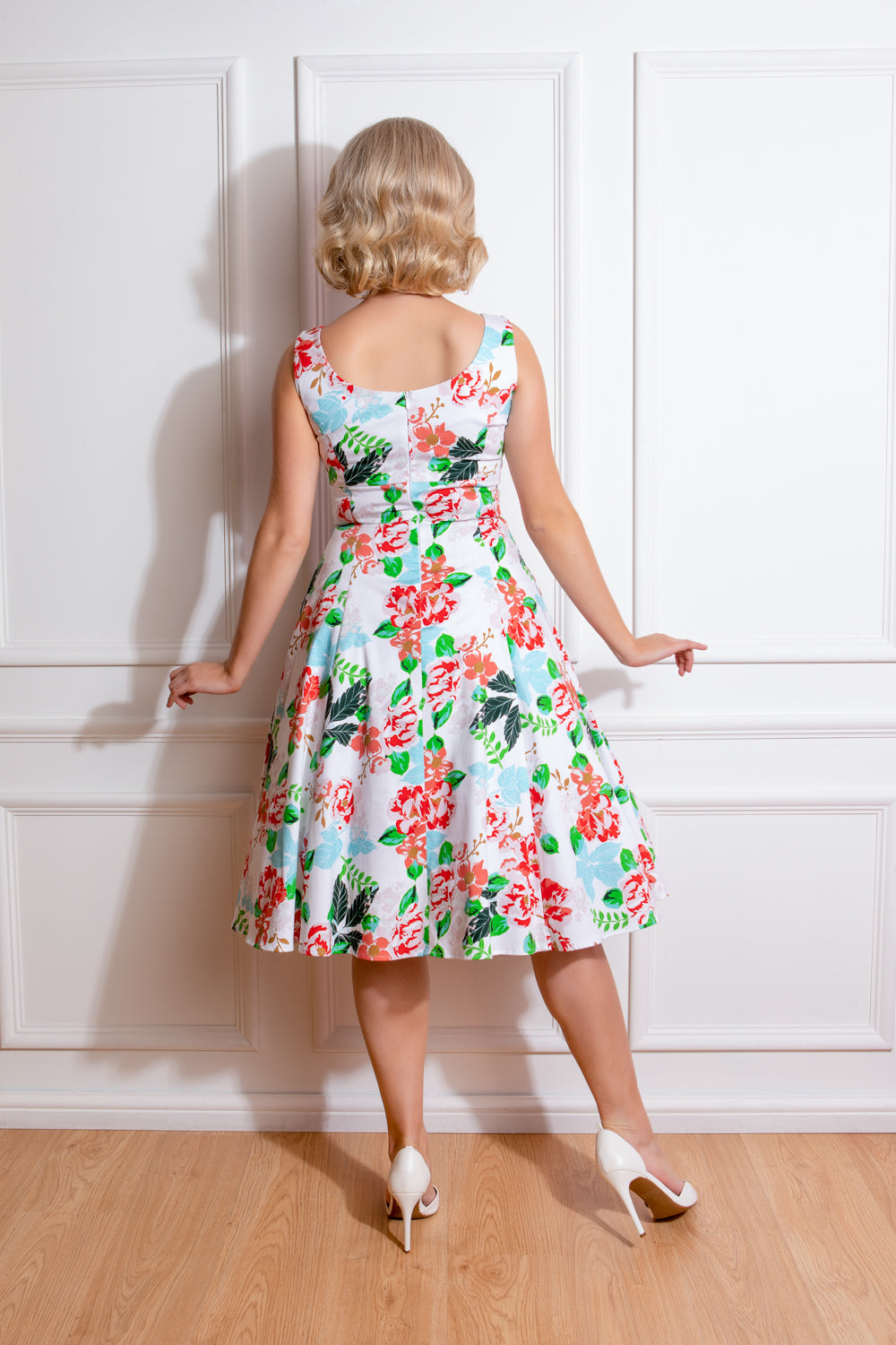 Introducing this new style, the Lyla Floral Swing Dress. Featuring a classic sweetheart neckline and a scooped back on a beautifully constructed fitted bodice. The wide shoulder straps are elegant and anchor the retro style. While the swooshing swing skirt allows for fun movement in the piece.