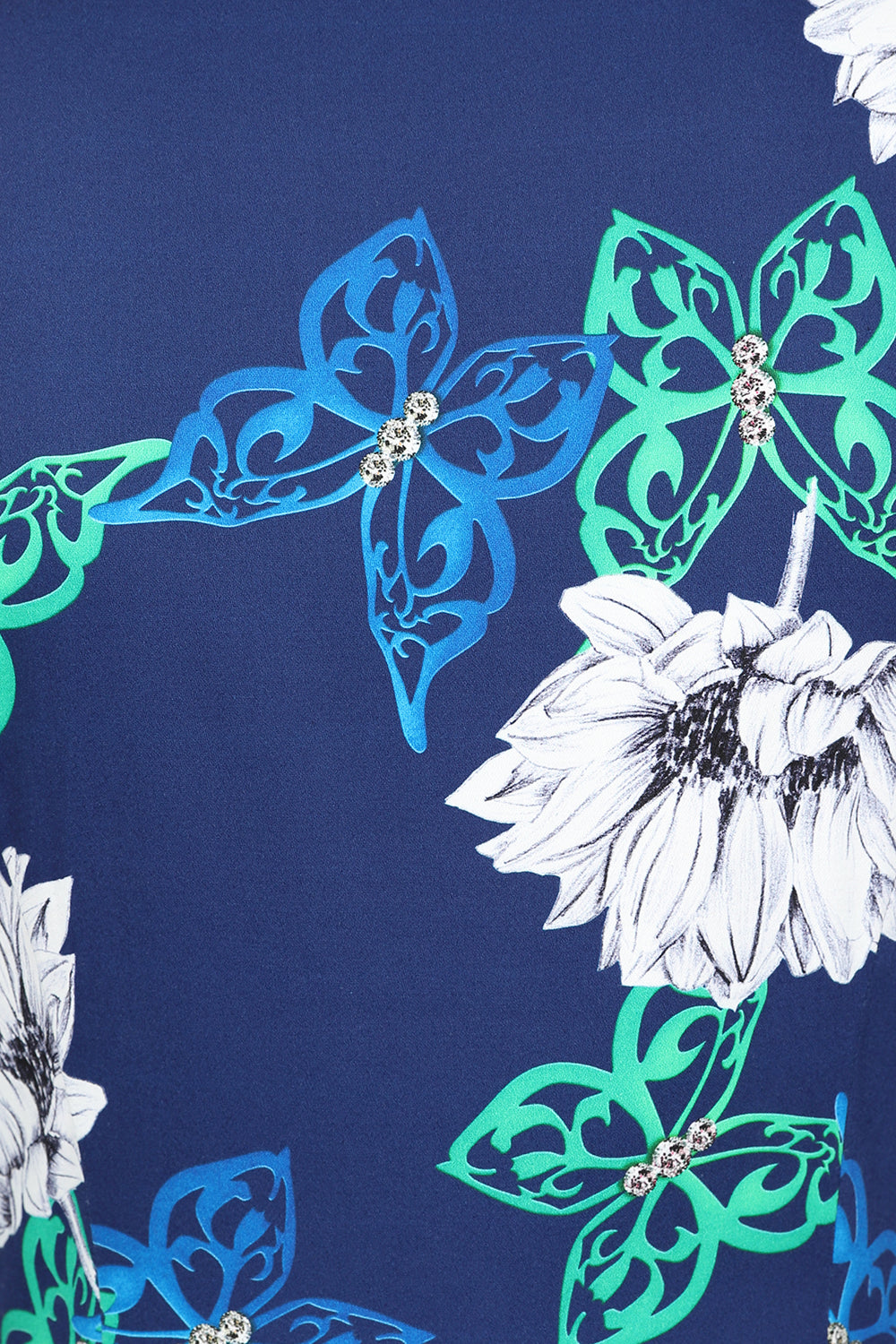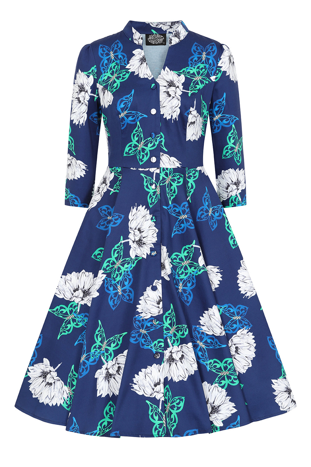 Made to be seen, the brand-new Gloria Floral Swing Dress is bursting with bright greens, blues, whites and navy's. The beautiful, bold and bright butterflies stand out on this swing style which is perfect for a picnic in the park or an evening dinner. The sweet diamond studded butterfly print makes this a playful piece for the winter months, bringing light into the darker evenings. The v neckline with stand collar gives a classic structured feel alongside the gathered ¾ length sleeves. The front decorative buttons add an extra design detail which cascades down the front of the style. We added the ever favourite hidden side pockets for added ease. Just pair this dress with your favourite flats or heels and you’re all set!