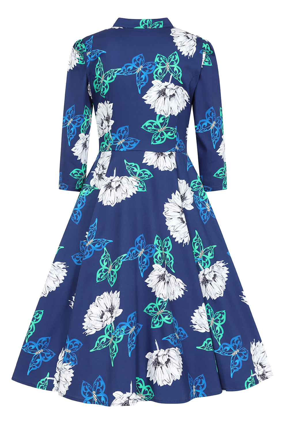 Gloria 1950s 3 Quarter Sleeve Floral Butterfly Blue Swing Dress