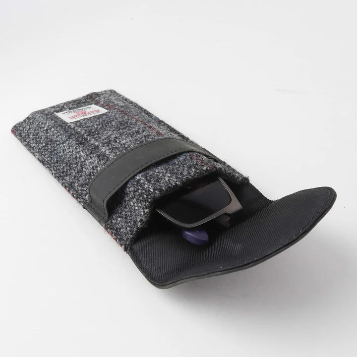 Our classy glasses case is made from authentic leather and pure virgin wool called Harris Tweed which is one of the world's most famous materials produced by crofters on the Isle of Harris. This grey Harris Tweed pattern mixes traditional design with a modern twist. The soft check tweed fabric combined with an antiqued black leather trim gives this range that distinctive English heritage look. This would make the perfect gift for your loved ones or a treat just for yourself.
