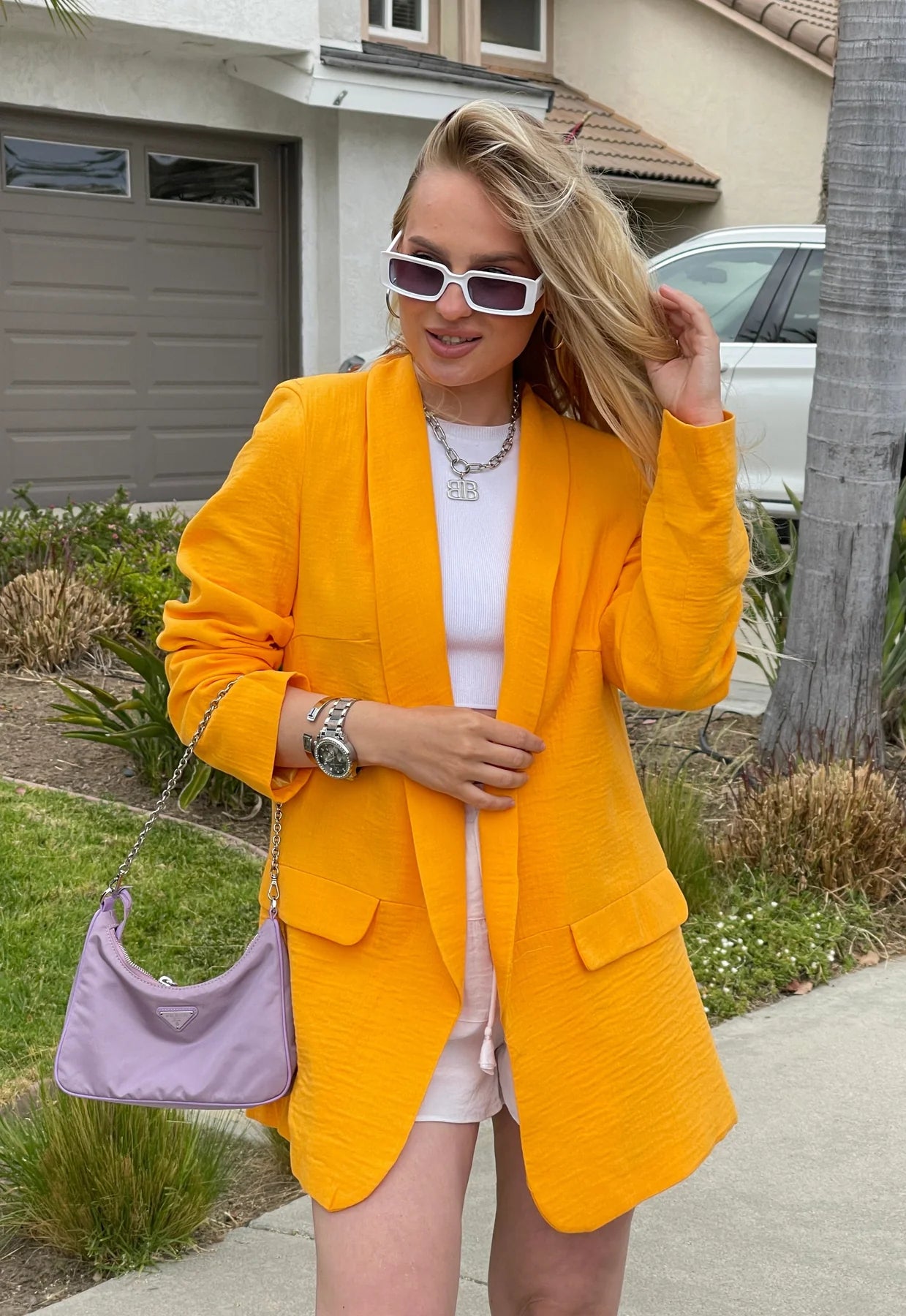 Oversized Longline Blazer/Jacket in light orange with slim lapel. Decorated with 2 side envelope pockets.