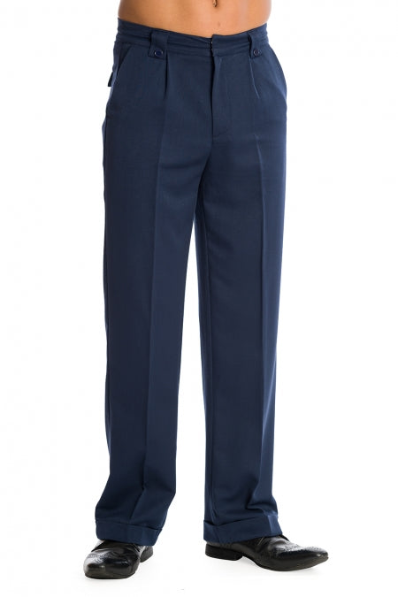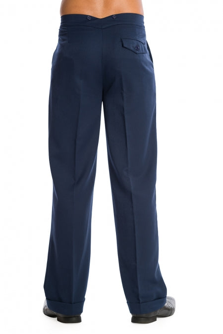 A bit of style for the man about town... these navy blue trousers feature 2 in seam pockets, a buttoned back pocket. Two tabs on the front waist. Buttons for braces, with a stylish v in the back waist. The bottoms are turn up style.