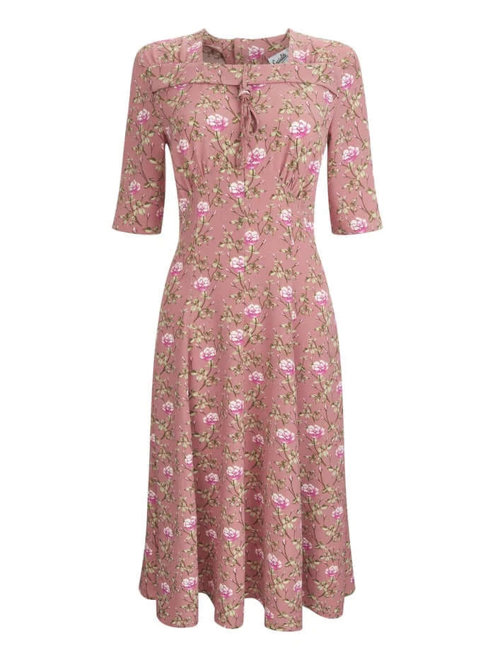 1940s Replica Dusky Pink Floral Tribute Square Neck Dress With Sleeves