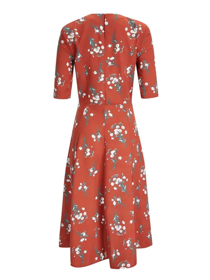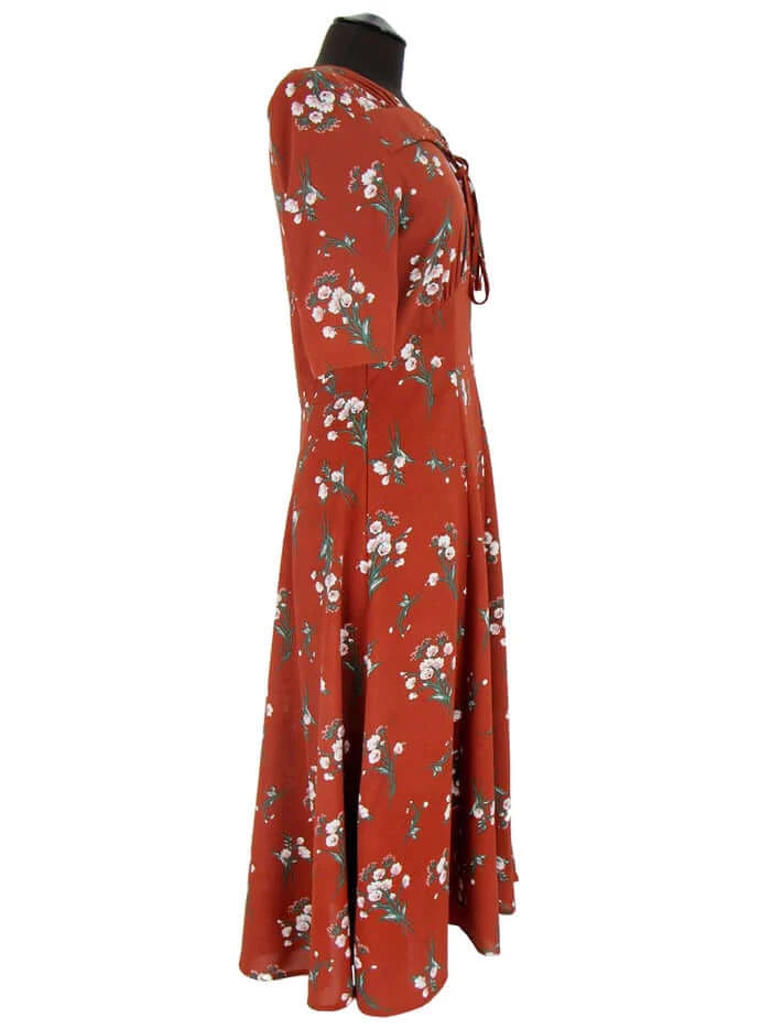 This deep rust brown or russet ditsy floral frock looks like it has just stepped out of the forties era. Replicated from an original rationed 11011 or "double elevens" dress, the Tribute is authentic, feminine and flattering.