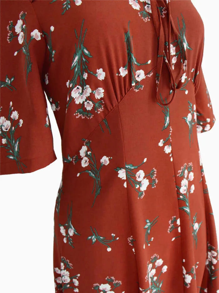 1940s Replica Russet Floral Tribute Square Neck Dress With Sleeves