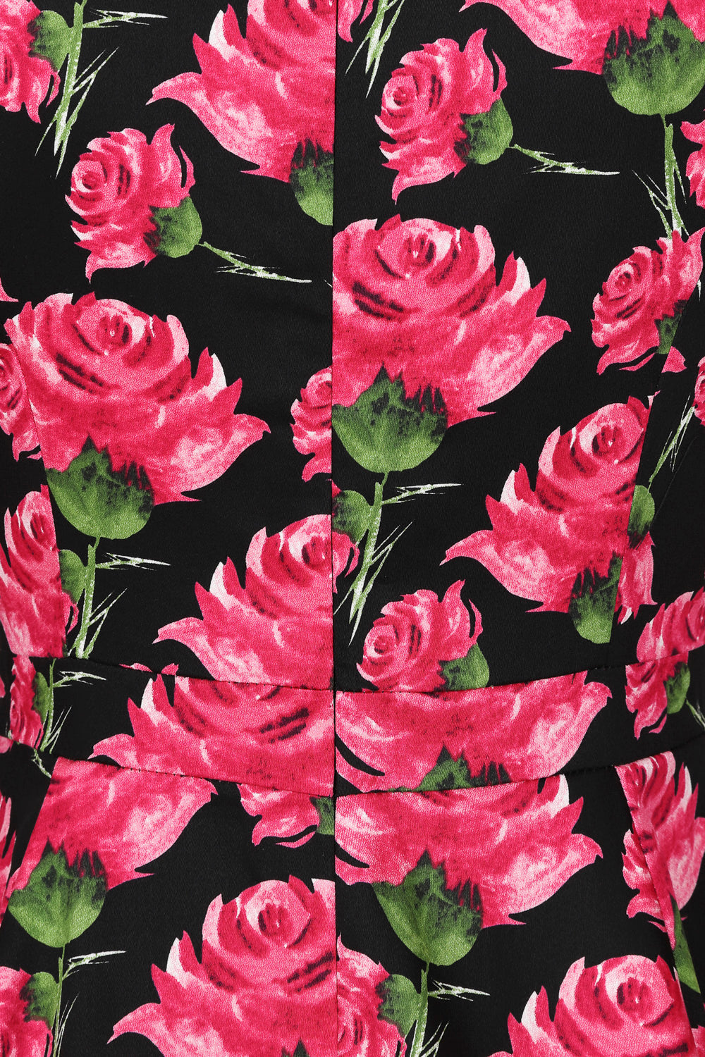 Behold the new vintage darling swing dress, in a bold print of pink roses set on a stretchy black cotton fabric.