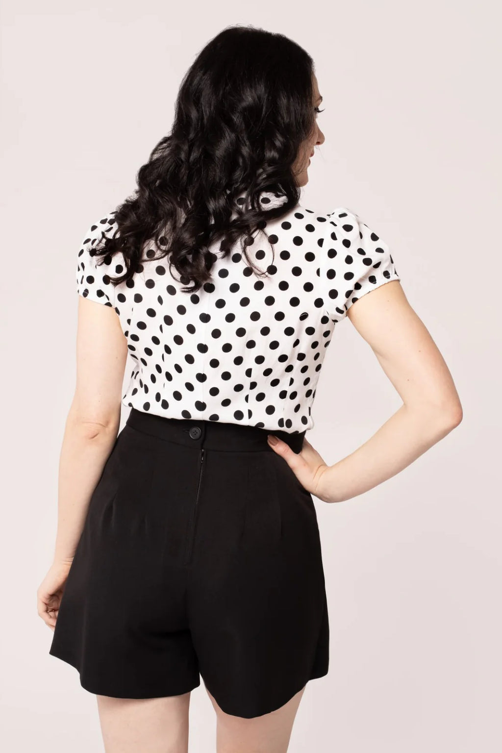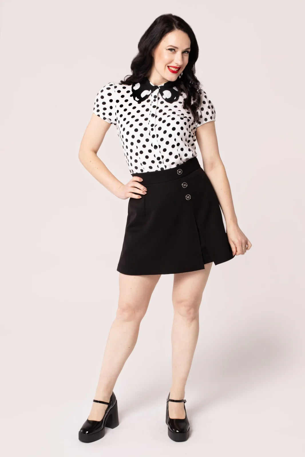Main fabric is white base with black polka dots, Short puff sleeves with elasticated cuffs and button up front with black buttons