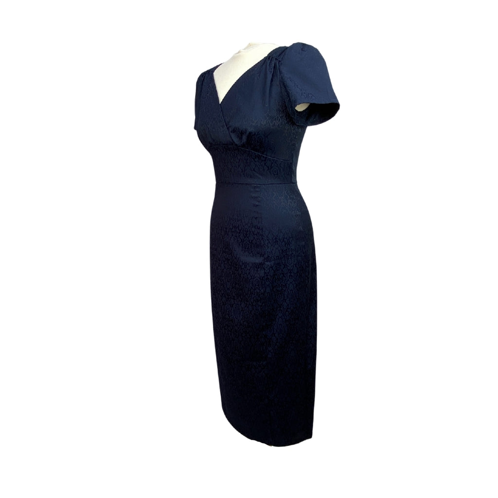 Calling all sultry sirens... Rebecca is truly stunning and stretchy! Flaunt those curves in this flattering below the knee wiggle dress, with its beautiful gathered details and wrap look bust and a slit in the back for movement.